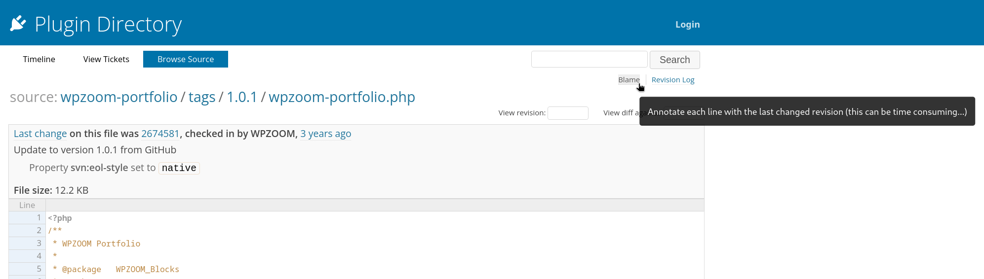 Trac’s built-in “Blame” functionality lets you view the commit history associated with each line of code in a file. This feature helps you quickly identify who made a change, when it was made, and why. You can use this functionality directly within Trac’s web interface by navigating to the desired file (in /trunk/ or /tags/ and clicking the “Blame” link in the top right hand corner.