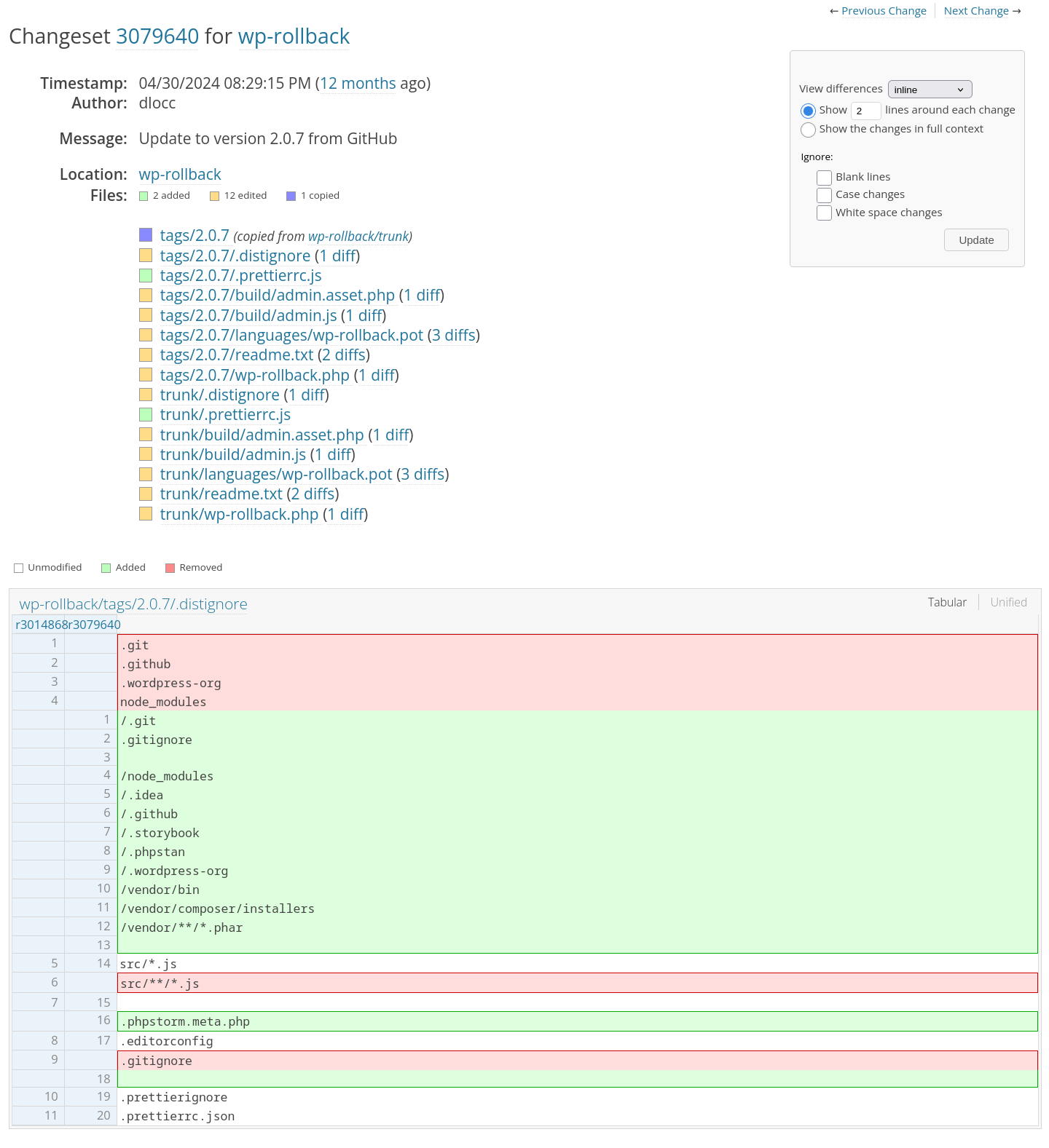 Every plugin and theme listed on WordPress.org has a Development Log that shows a changelog of commits made to its repository. This view is powered by Trac and includes access to changesets, which are specific snapshots of what was added, removed, or modified in a given commit.