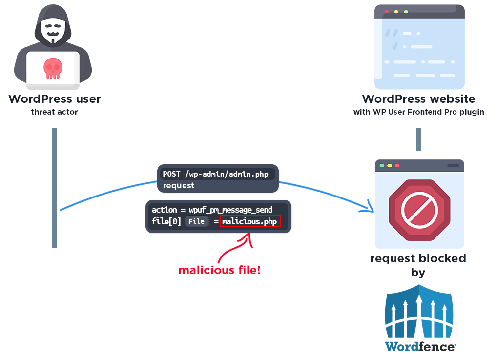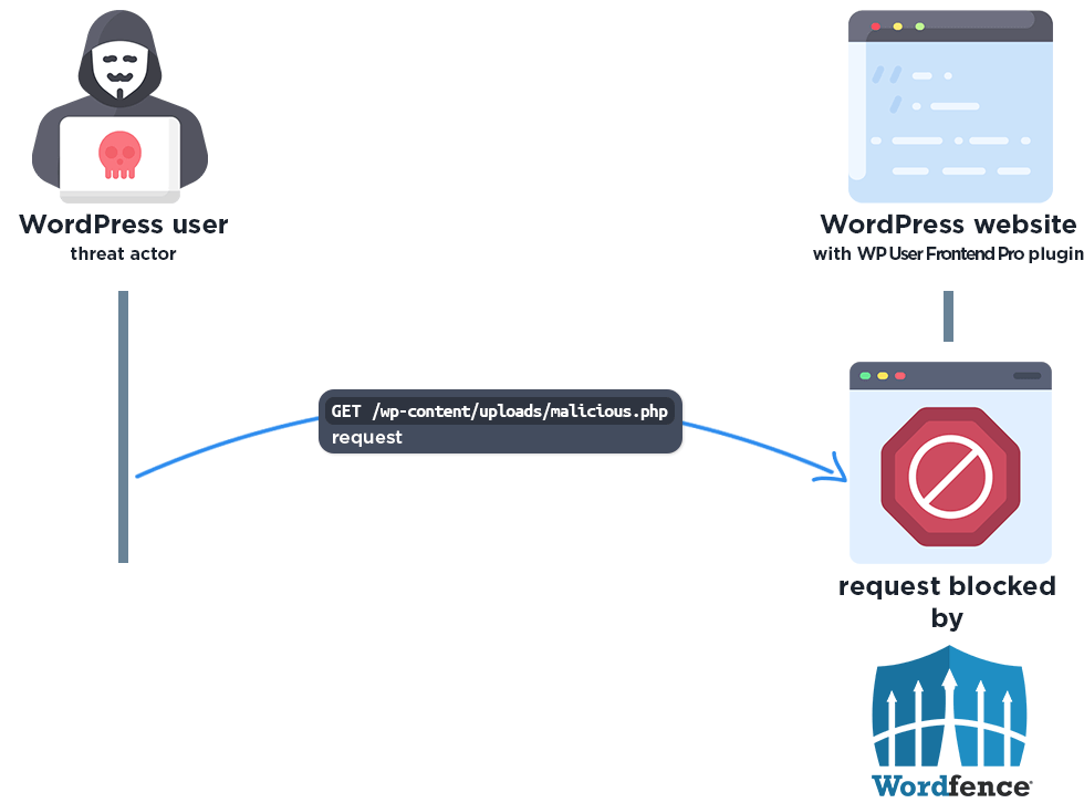 The following graphic demonstrates the steps to exploitation an attacker might take and at which point the Wordfence firewall would block an attacker from successfully exploiting the vulnerability.